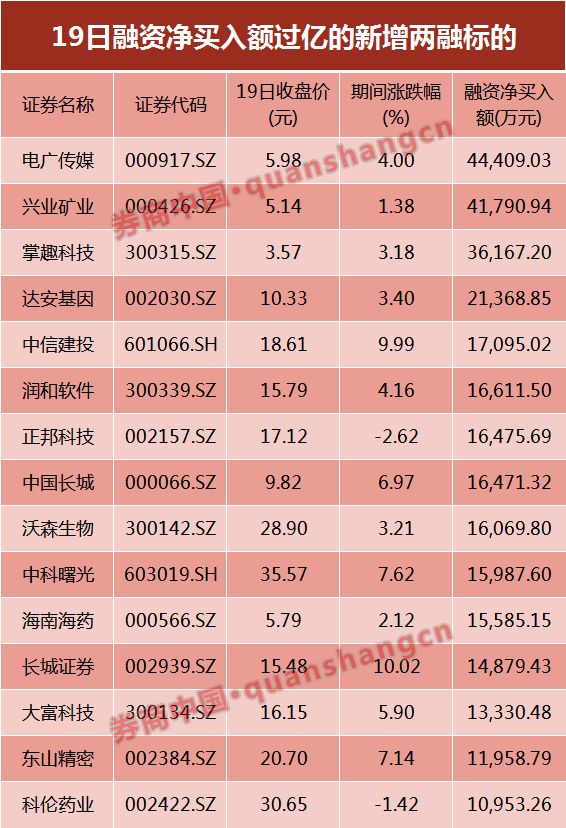 个股表现而言,有17只新增两融标的19日的融资余额超过亿元,其中电广传媒、兴业矿业的融资余额超过4亿。值得一提的是,券商股中信建投和长城证券作为新增标的,19日的融资净买入额均超亿,且均涨停,20日个股表现涨势分化之际,这两只股票均上涨。