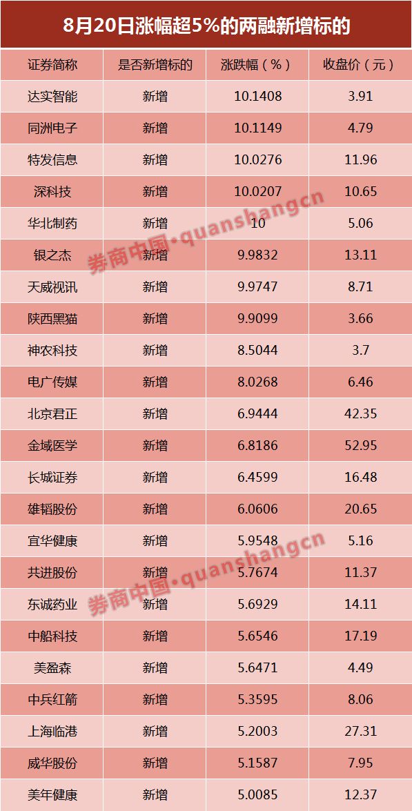 虽然8月20日沪指、创业板指均下跌,但新增两融标的中,依然有324只股票上涨,仍然受到市场资金的青睐,两融扩容标的依然是不少资金追逐的主力。