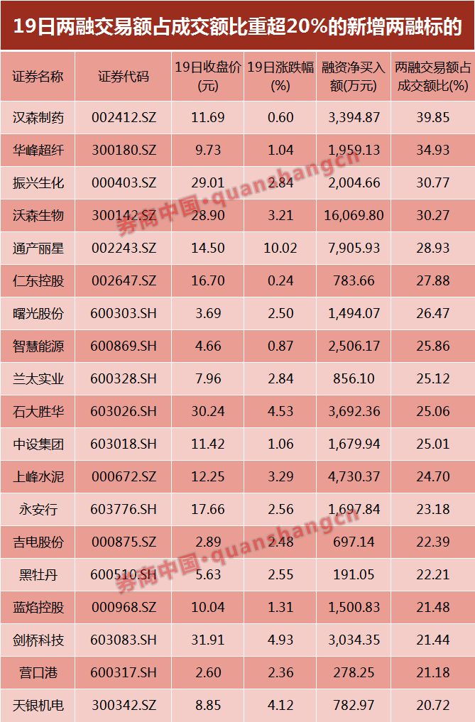 记者梳理,有19只个股两融交易额占成交额的比例超过20%,其中,汉森制药、华峰超纤、振兴生化、沃森生物等个股当天两融交易额占成交额的比例超过30%。