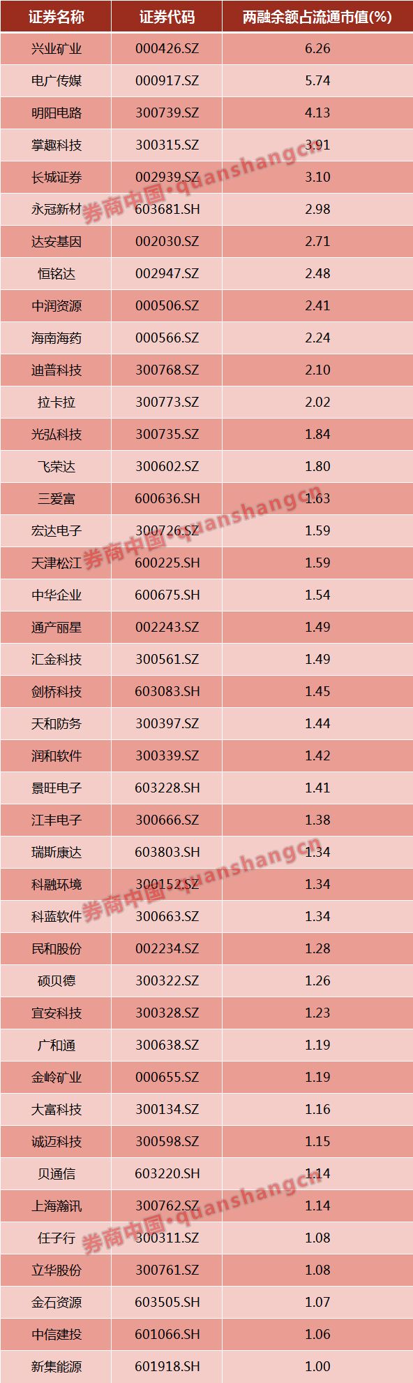 从个股来看,有12只个股两融余额占其流通市值的比例大于2%,其中兴业矿业两融余额占流通市值比例达到6.26%,电广传媒昨日两融余额占流通市值的比例为5.74%,阳明电路比例为4.13%,掌趣科技和长城证券昨日两融余额占流通市值的比例大于3%。