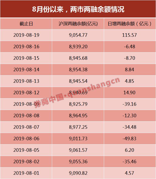 这天,两融市场表现如何?据沪深交易所20日早间公布的数据,8月19日两融余额为9054.77亿元,较上一交易日增加115.57亿元。其中,融资余额为8930.47亿元,融券余额为124.30亿元。记者梳理发现,这是自4月10日以来,两融余额日增规模最多的一个交易日。今年春节后,A股迎来牛市行情,所以4月份之前市场交易更加活跃,两融余额增加值较大。