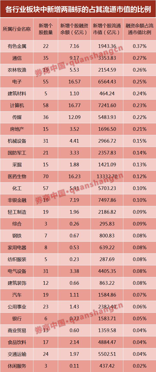 从板块来看,记者梳理发现,有色金属行业新增两融标的的融资余额占流通市值的比例最高,达到0.37%,说明这个板块昨日最受杠杆资金青睐,通信行业、农林牧渔、电子、建筑材料、计算机、传媒、房地产等行业的新增标的也较受资金青睐。