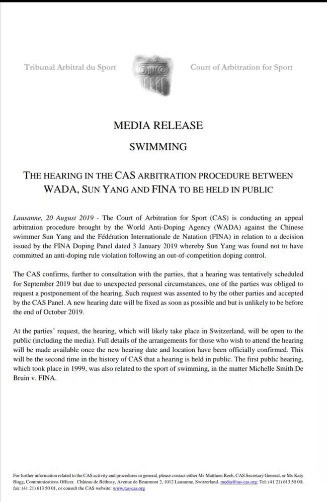 北京时间8月21日,国际体育仲裁法庭官网宣布,原定于9月举行的孙杨的听证会,因特殊原因,将会延期进行。同时,还确认听证会将在瑞士公开审理,这是体育仲裁法庭第二次公开审理。