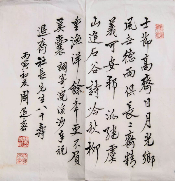 王退斋除了擅作诗词,也长于书画。据王佩玲介绍,在书法上,虽然他读过不少字帖,但基本还是写颜体字,“父亲从小崇敬颜真卿一生忠烈人品极高,其书法雍容大度,充溢阳刚之美。父亲用‘字正腔圆’释义书法:字如其人,心正字芯正,所谓‘腔圆’,是书写的气场,是‘浩然之气’!”