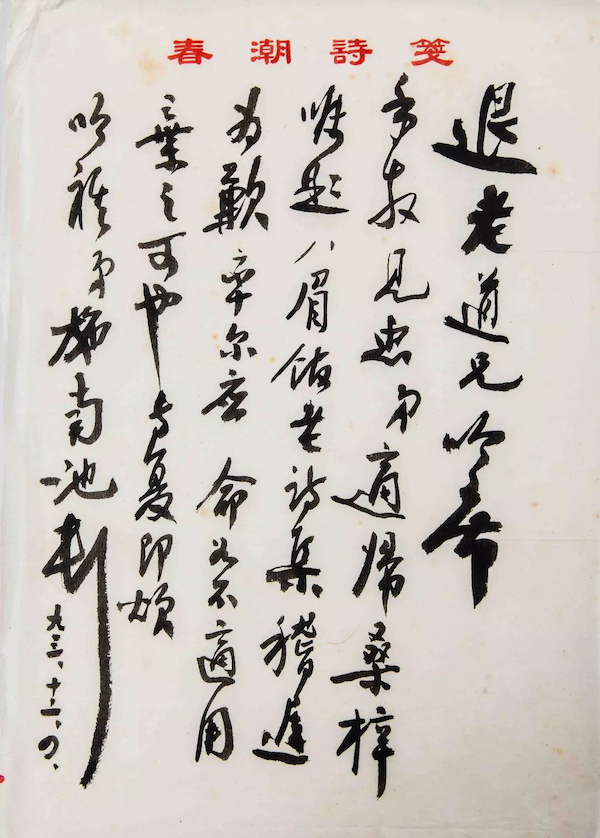 上世纪80年代,曾有多处请他的墨宝。在为梅兰芳纪念馆题写的对联中,他将书法转而优雅的风格:“举凤回鸾,引商刻羽,绝艺抎梨园,一代声华蜚薄海;蓄须明志,援手振灾,高风崇梓里,千秋典范重乡邦。”