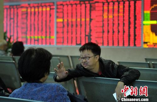 资料图:证券交易大厅内股民交流。 中新社记者 刘忠俊 摄