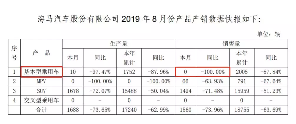9月4日晚间,*ST海马(000572)发布公告披露8月产销数据。值得关注的是,公司基本型乘用车——也就是轿车,生产量为10,同比下降97.47%;基本型乘用车销量为0,同比下降100%。