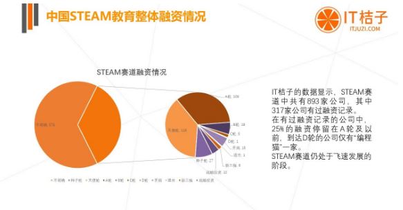 根据 IT 桔子的数据显示,STEAM 赛道中共有 893 家公司,其中 317 家公司有过融资记录。在有过融资记录的公司中,25% 的融资停留在 A 轮及以前,到达 D 轮的公司仅有「编程猫」一家。