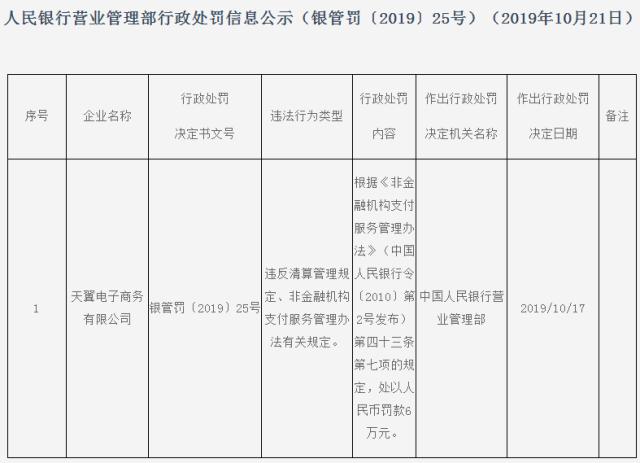 站长之家(ChinaZ.com) 10月24日 消息:近日,据人民银行营业管理部行政处罚信息公示显示,因违反清算管理规定、非金融机构支付服务管理办法有关规定,翼支付被处以人民币罚款6万元。