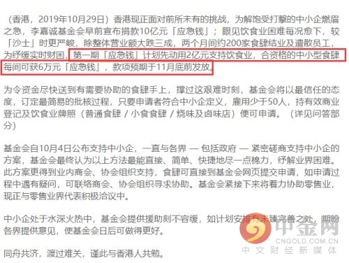 早前,李嘉诚基金会宣布决定捐资10亿港元支持中小企业。29日,基金会公布计划细节,首批“应急钱”将支持香港本地的饮食业,共计2亿元港元。