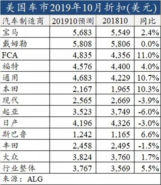 Cox Automotive表示,10月份平均折扣金额接近历史最高水平,这在很大程度上抵消了零售需求的疲软。J.D. Power表示,上个月的平均折扣达到4,145美元,高于去年同期的3,872美元。ALG估计,与2018年10月相比,上个月新车折扣增长4.7%至3,767美元。在主流车企中,底特律三巨头和日产汽车公司折扣力度最大。(见下表)。