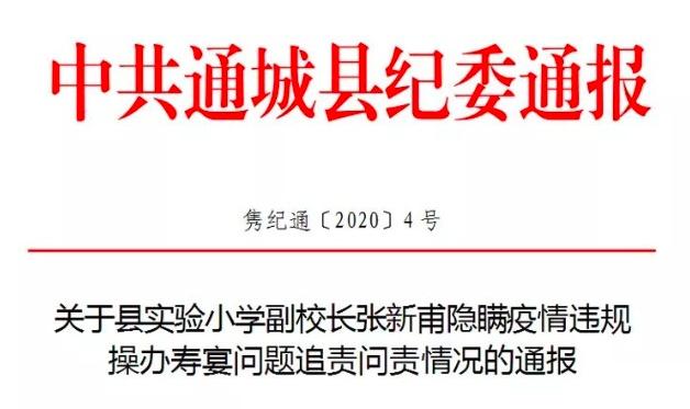 2月5日,湖北省咸宁市通城县纪委发出通报,对该县实验小学副校长张新甫隐瞒疫情、顶风违规操办寿宴、对抗组织调查等问题进行追责问责。