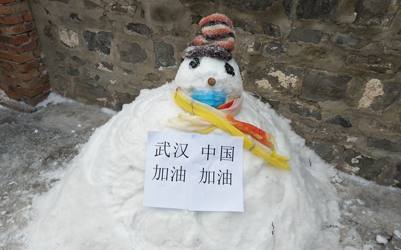 大雪中村民堆起了雪人,雪人胸前还写着“武汉加油 中国加油 ”。延庆区四海镇政府供图