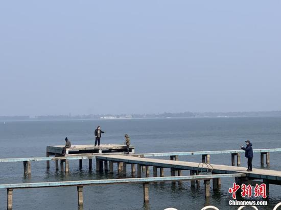 1月29日,一些市民来到位于武汉大学凌波门外的东湖栈桥上,佩戴口罩晒太阳。 中新社记者 杨程晨 摄