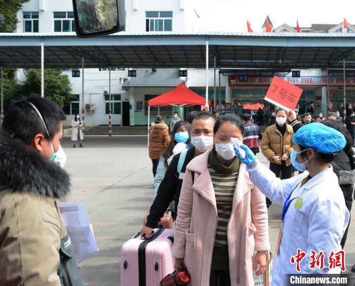 体温测量、消毒、健康登记……在贞丰县集中出发点,医护人员为每一位返岗人员进行安全体检。