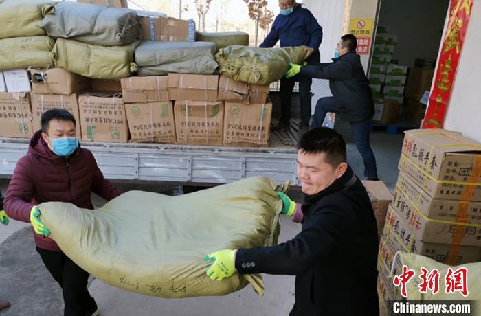 阿克苏药品集散中心工作人员在机场运回防护物资。 阿克苏药品集散中心供图