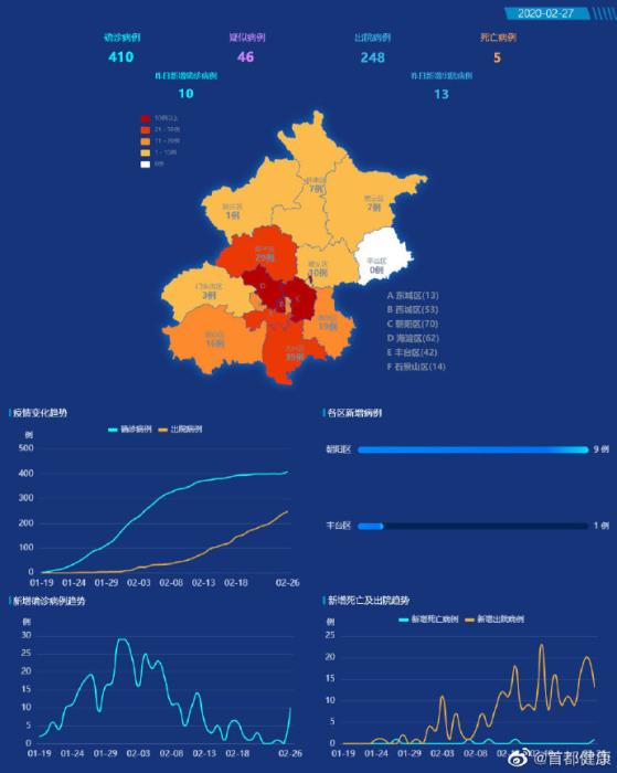 截至2月26日24时,北京市累计确诊病例410例,出院248例,死亡5例。确诊病例中东城区13例、西城区53例、朝阳区70例、海淀区62例、丰台区42例、石景山区14例、门头沟区3例、房山区16例、通州区19例、顺义区10例、昌平区29例、大兴区39例、怀柔区7例、密云区7例、延庆区1例,外地来京人员25例。平谷区尚未有病例。