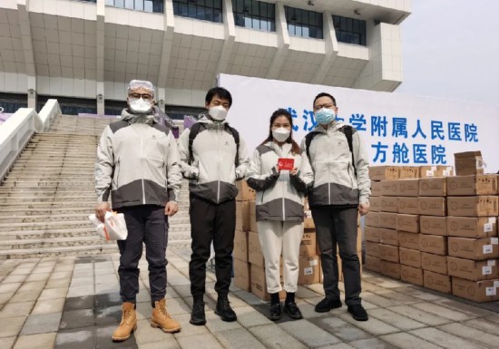 2月21日,人民网记者进入洪山体育馆武昌方舱医院采访前合影。右二为记者张婵。