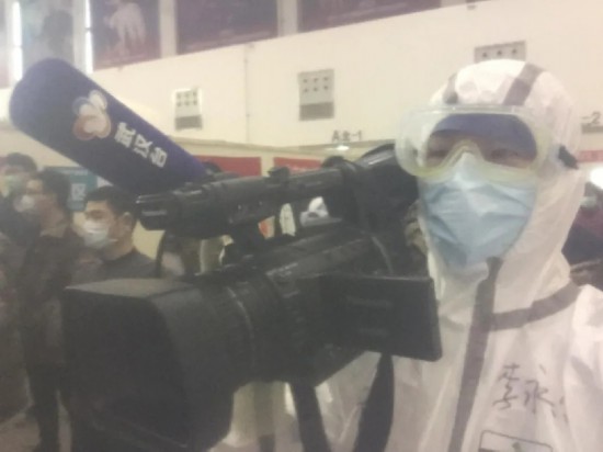2月5日,湖北广播电视台记者史磊在洪山体育馆武昌方舱医院门口采访拍摄。