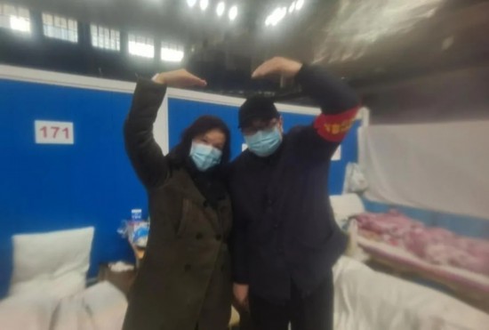 人民网湖北频道记者张婵为洪山体育馆武昌方舱医院的患者拍合影。