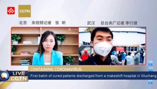 2月11日,中央广播电视总台中国之声特别报道部记者李行健在武昌方舱医院前与央视频连线,并通过CGTN等平台同步直播。
