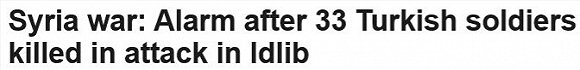【叙利亚政府军在伊德利卜发动袭击致33名土耳其士兵丧生】周五,叙利亚政府军在反对派控制的叙利亚西北部伊德利卜省发动袭击,造成至少33名土耳其士兵死亡。 支持叙反对派的土耳其表示,作为回应,他们击中了200个政府军目标,致309名士兵受伤。