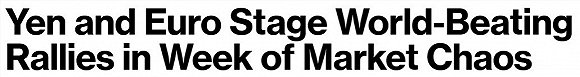 【全球市场混乱一周中,日元和欧元成货币市场赢家】在全球市场数十年来最痛苦的其中一周中,日元和欧元成为全球货币市场的赢家。截止周五,本周日圆上涨2.6%,创下自2016年以来的最大单周涨幅,也是全球主要货币中涨幅最大的。截至伦敦时间下午1点25分,日圆兑美元汇率为108.68日圆/美元。欧元也出现6月份以来的最大涨幅。欧元兑美元本周上涨1.2%,至1.0973美元,此前曾触及1.1053美元的高点。