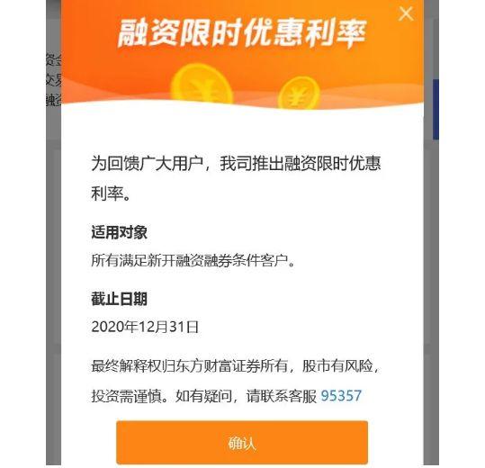 记者梳理发现,确实有个别券商对两融客户进行了限时优惠。比如东方财富证券官网显示,即日起至2020年12月31日,对所有满足新开融资融券条件客户实施融资限时优惠利率,低至6.99%。