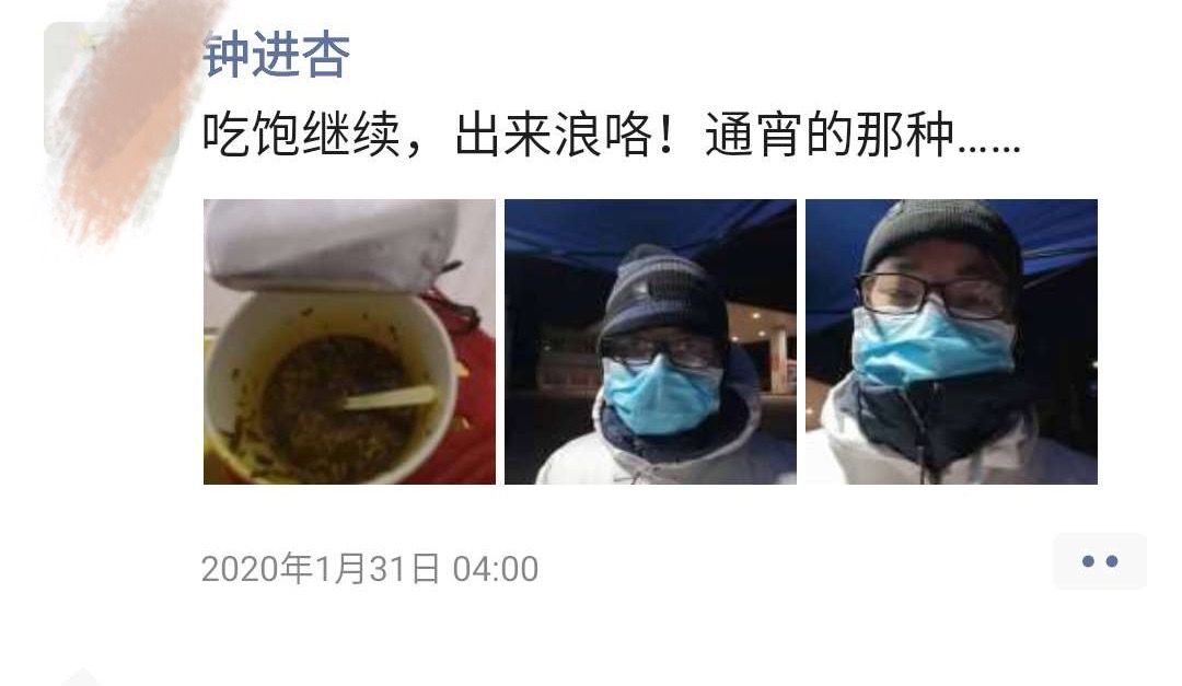 蓝小青非常难过。她想不通为什么比她还小6岁的年轻医生就这么走了,想着想着,就掉下眼泪,忍不住翻开钟进杏最后一条朋友圈,“吃饱继续,出来浪咯!通宵的那种……”配图是吃光的泡面碗和穿着防护服的自拍照,时间为1月31日凌晨4点。