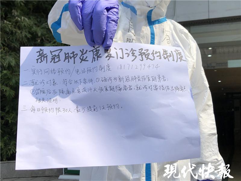 现代快报讯(特派记者 王卫 / 文 张浩然 / 摄)随着新冠肺炎出院人数越来越多,复诊和康复将成为新的问题。3 月 5 日,湖北省中医院挂牌开设新冠肺炎康复门诊,对治愈者在恢复期间进行问诊,据了解,这也是湖北首家新冠肺炎康复门诊。