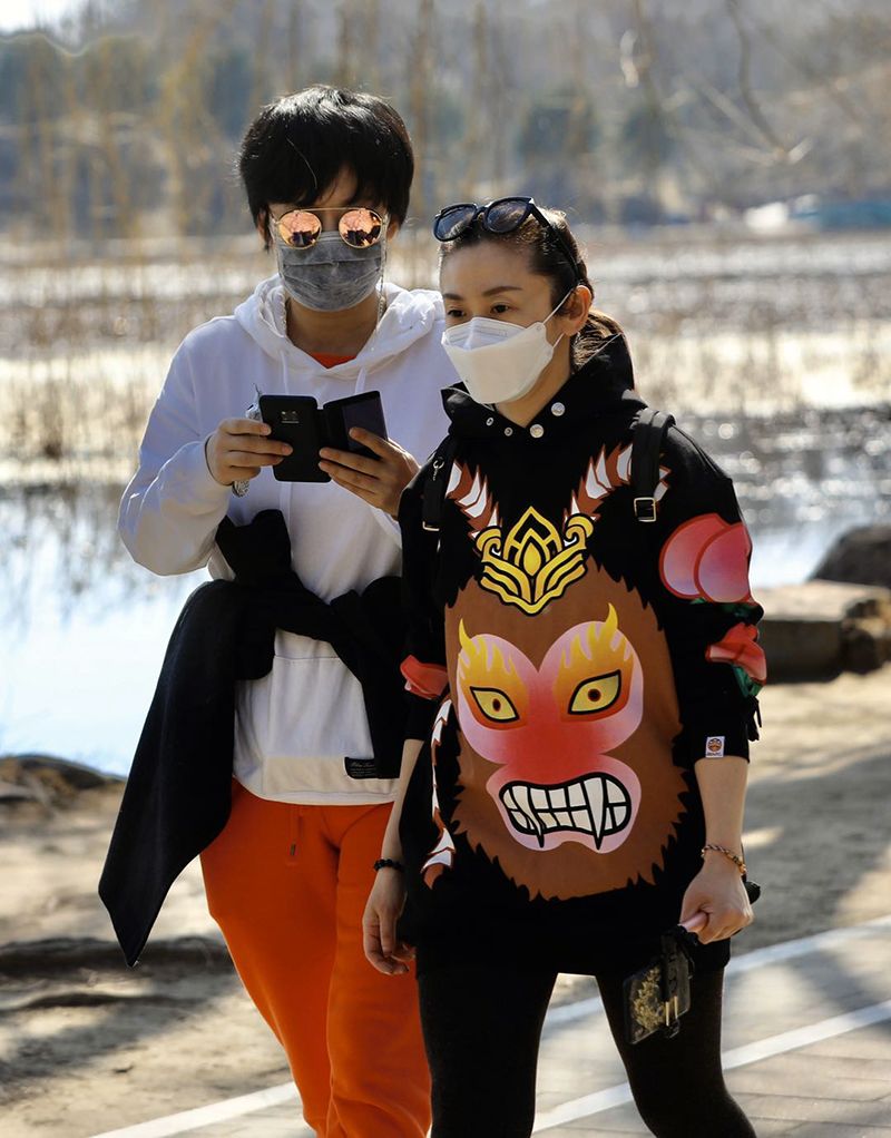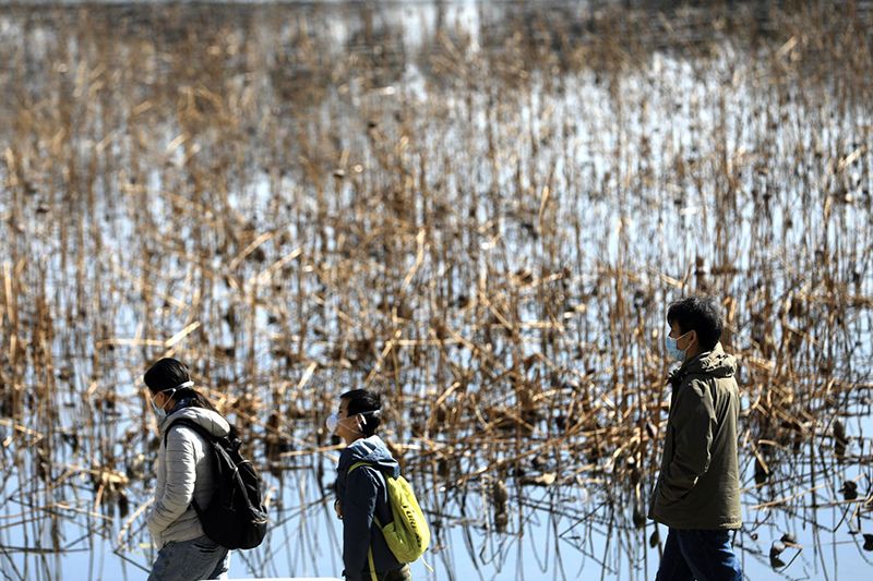 新京报讯 3月7日,京城阳光明媚,新京报记者在圆明园看到,游客佩戴口罩,在公园内参观游玩。