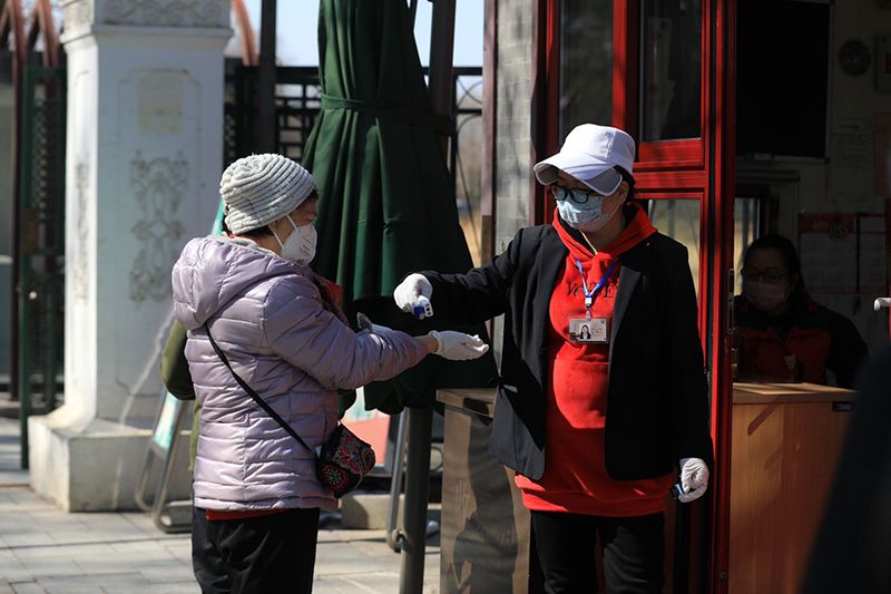 公园工作人员戴着护目镜、口罩,手拿测温仪在执勤。