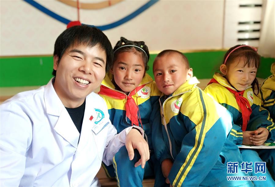 罗花南(左一)和西藏阿里孔繁森小学的学生们在一起(2019年3月20日摄,手机照片)。新华社发