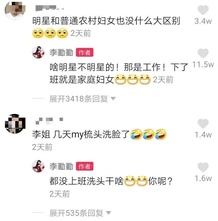 说话的时候,她的嘴角还带着饭渣,看起来十分邋遢,不雅观。如此接地气的生活也被网友吐槽不像明星,李勤勤随后霸气怒怼网友:啥明星不明星的,那是工作,下了班就是家庭妇女。