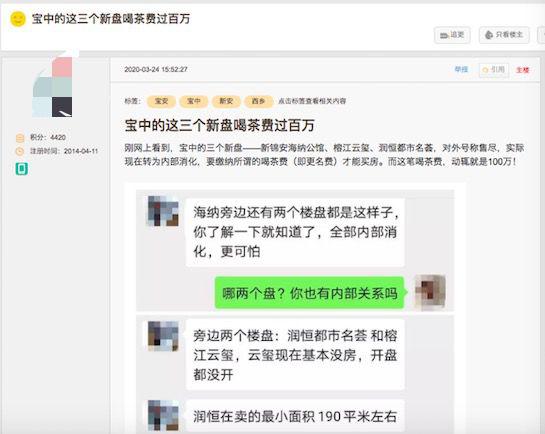 中证君求证卖房渠道人士得知,当前深圳宝安确有几个楼盘购房需缴纳不同价位的“喝茶费”,以海纳公馆为例,116平米总价1150万左右的新房“喝茶费”需70余万元。