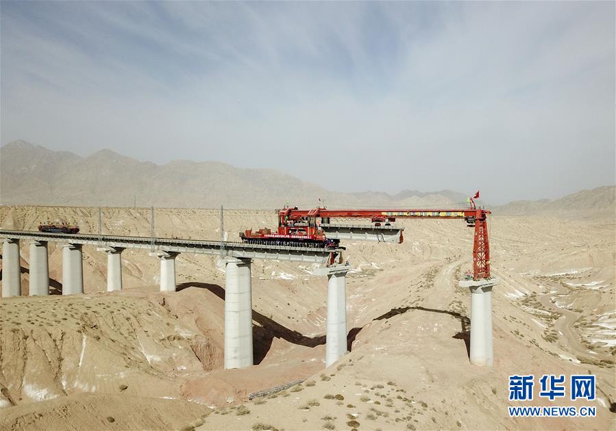 3月21日,工人们在国家重点铁路建设项目——格库铁路骆驼泉2号特大桥现场施工(无人机照片)。新华社发 (陈剑飞 摄)