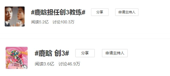 鹿晗担任创3教练早已被工作室证实, 而且热度也是相当高,不论是“鹿晗担任创3教练”还是“鹿晗创3”的话题阅读均破亿。虽说鹿晗此前参演的《上海堡垒》令他备受质疑,但如今看来,鹿晗依旧是当红流量明星。