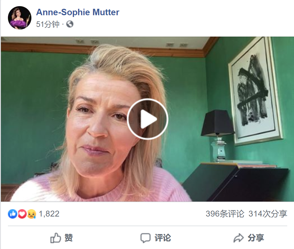 新京报讯 (记者刘臻)当地时间3月26日,德国小提琴家安妮-索菲·穆特通过自己的社交媒体宣布,她的新冠肺炎检测呈阳性。在一段视频中穆特表示:“我的新冠肺炎检测呈阳性,我在家里被隔离了很长时间,并期待着完全康复。非常希望能很快再次为你们进行现场演奏。对于一个艺术家来说,不能演奏是一件非常遗憾的事情,但相信更好的时光会很快到来。”