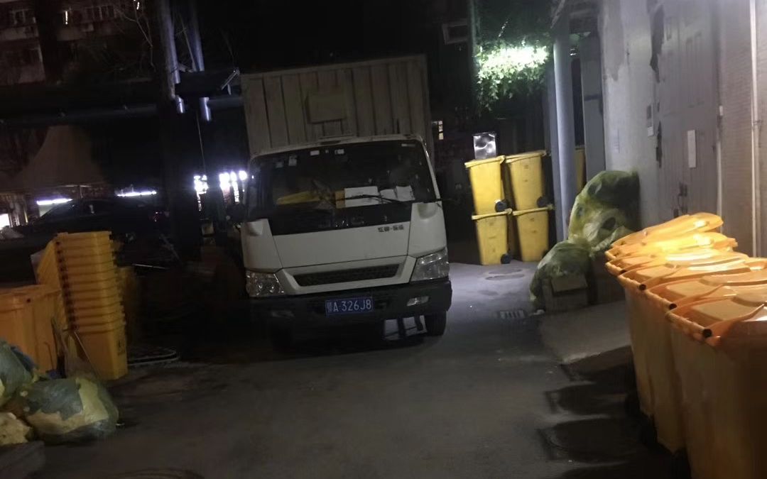 以往,每晚7点半左右,医废处理公司的转运车会来武汉市第一医院拉走一天积存的废物。每当车来,龚汉民会把车上的空桶卸下来,再把暂存间内装满医废的周转桶搬上车。每天,转运车会拉走1-2车医废到处置点,每车可以拉36桶。