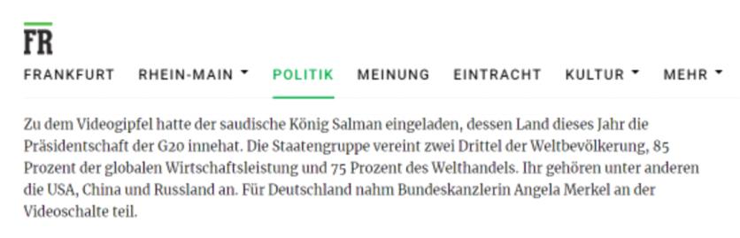 德国《法兰克福评论报》报道称,包括中国、美国和俄罗斯在内的二十国集团国家,国内生产总值占到全球的百分之八十五,贸易额占到全球的百分之七十五,所占人口为全球的三分之二。各方承诺加强国际合作,应对共同疫情挑战,达成这样的共识意义重大。