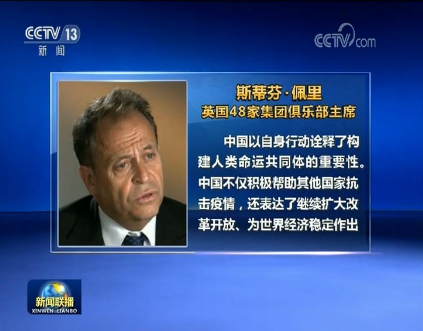 英国48家集团俱乐部主席斯蒂芬·佩里接受总台记者采访时说,中国以自身行动诠释了构建人类命运共同体的重要性。中国不仅积极帮助其他国家抗击疫情,还表达了继续扩大改革开放、为世界经济稳定作出贡献的承诺,这种合作和开放的态度,在未来应对全球性问题上也是各国应该坚持的方向。