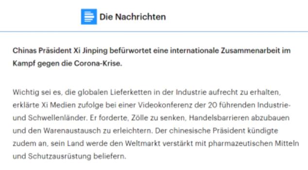 德国德意志广播电台报道习近平主席倡导通过国际合作抗击新冠病毒。文章称强调,习近平宣布将加大力度向国际市场供应药品、防疫物资等产品,是用实实在在的举措助力全球抗疫工作。
