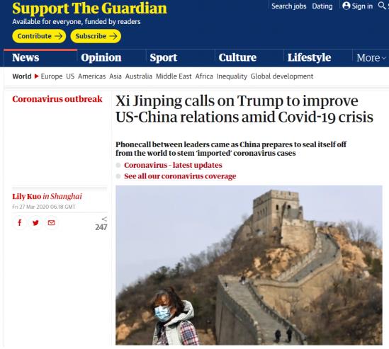 英国《卫报》称,二十国集团特别峰会后习近平主席同美国总统特朗普通电话,习近平指出中美合则两利、斗则俱伤,合作是唯一正确的选择,希望美方在改善中美关系方面采取实质性行动,双方共同努力,加强抗疫等领域合作,发展不冲突不对抗、相互尊重、合作共赢的关系。
