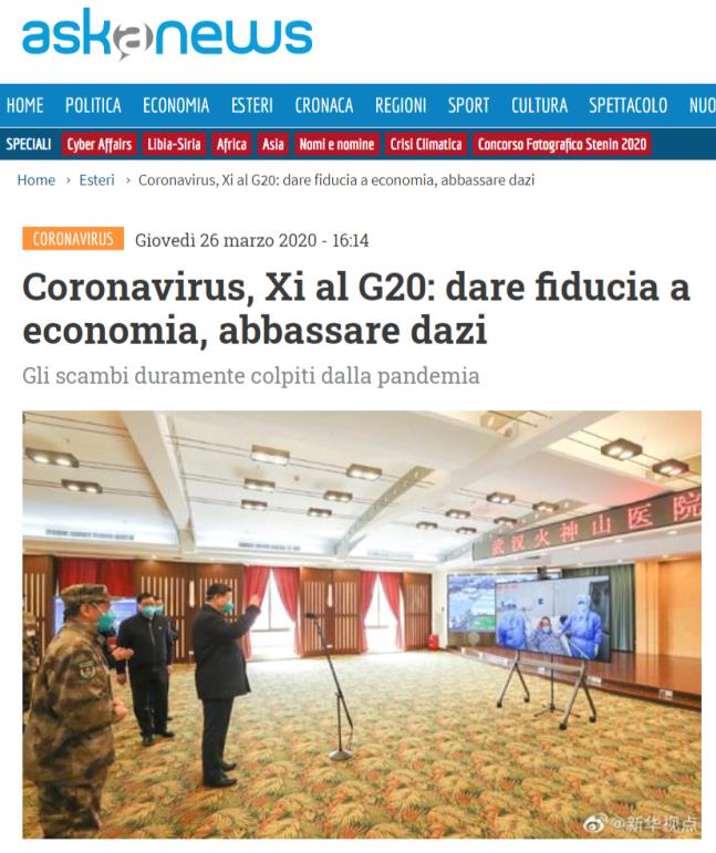 意大利主要新闻网站之一Askanews发表题为《习近平在抗疫G20峰会上讲话 提振经济信心 减免关税》的文章。文章称习近平主席向二十国集团成员呼吁,面对新冠肺炎疫情,各国应降低关税,发出有力信号,提振世界经济复苏士气。
