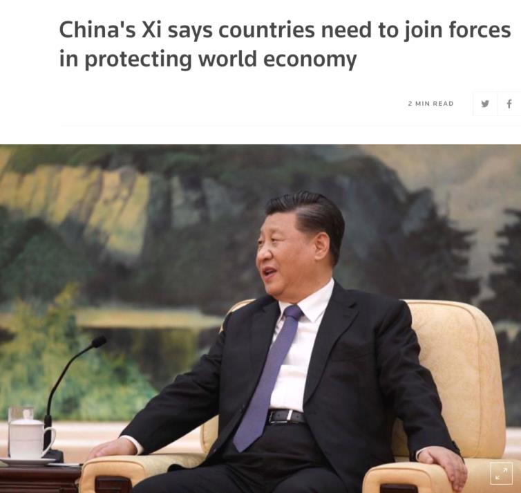 英国路透社指出,习主席就加强疫情防控国际合作、稳定世界经济,阐述中国主张。报道称,习近平指出疫情对全球生产和需求造成全面冲击,各国应该联手加大宏观政策对冲力度,防止世界经济陷入衰退。要实施有力有效的财政和货币政策,加强金融监管协调,共同维护全球产业链供应链稳定。报道称,习近平敦促二十国集团成员国削减关税,消除壁垒,促进贸易。中国将在继续实施积极的财政政策和稳健的货币政策的同时,增加进口和对外投资。