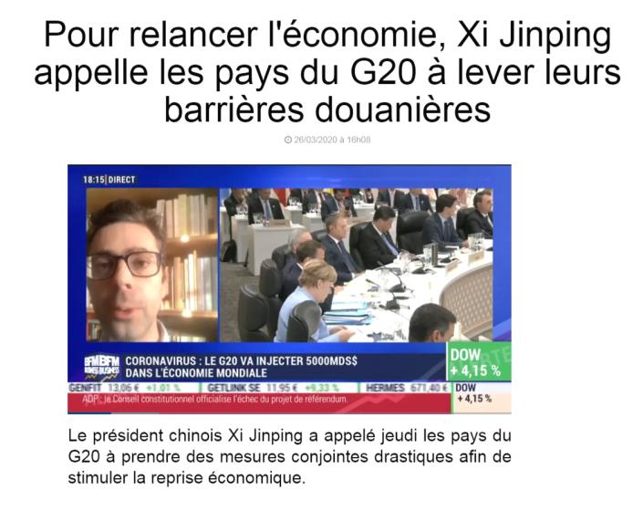 法国BFM电视台商业频道称,中国国家主席习近平希望二十国集团成员共同采取强有力的措施以刺激经济的回暖。法国《费加罗报》也指出,习近平呼吁各成员国降低关税,为经济发展恢复信心。