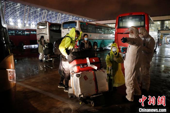 在浦东机场T1航站楼内,上海各区县驻机场工作人员正在引导入境人员上车前往集中隔离点。 殷立勤 摄
