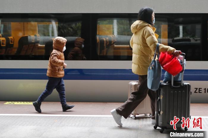 旅客带着孩子在铁路上海站乘坐火车前往自己的目的地。 殷立勤 摄