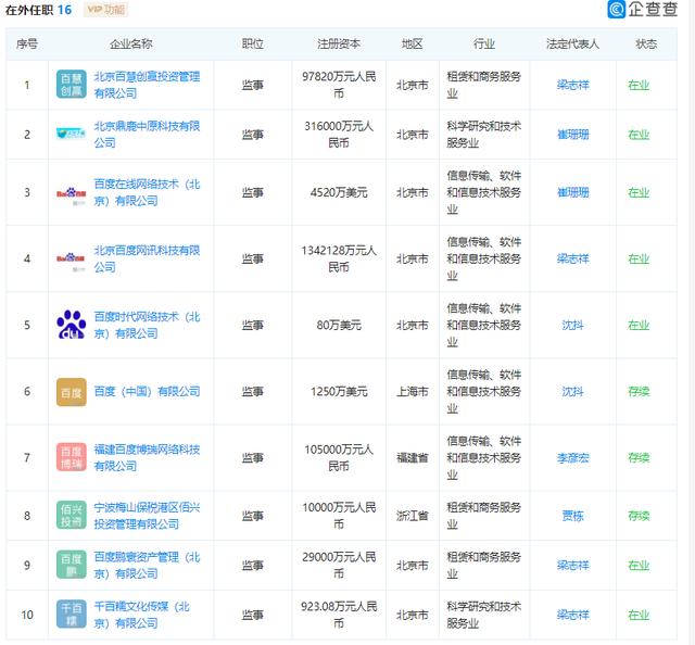 雷达财经通过“企查查”搜索发现,韦方在百度系16家公司任职,其中15家出任监事,任职公司包括百度网讯科技有限公司、百度搜索公司、北京鼎鹿中原科技有限公司(千千音乐)等。