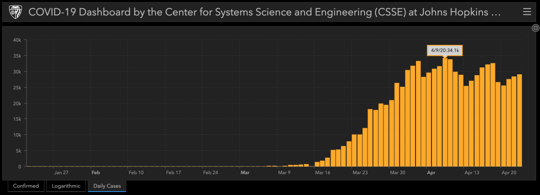 自3月30日起,美国单日新增确诊病例均高于2万例,最多时4月9日单日新增3.41万例。自3月31日起,单日新增死亡病例均高于1000例,最多时4月21日单日新增死亡2683例。两项数据引发关注。